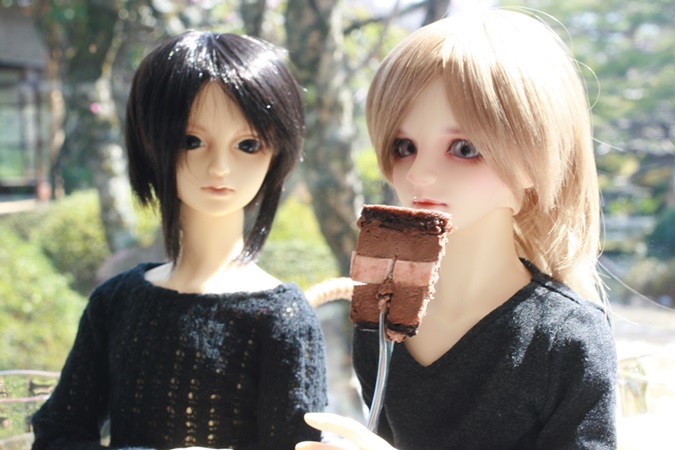 相方をお迎えしてくれないオーナーへの腹いせにケーキをヤケ食いする和純ちゃんと、それを心配そうに見つめる鼓弥多さん(SD13少年33番)